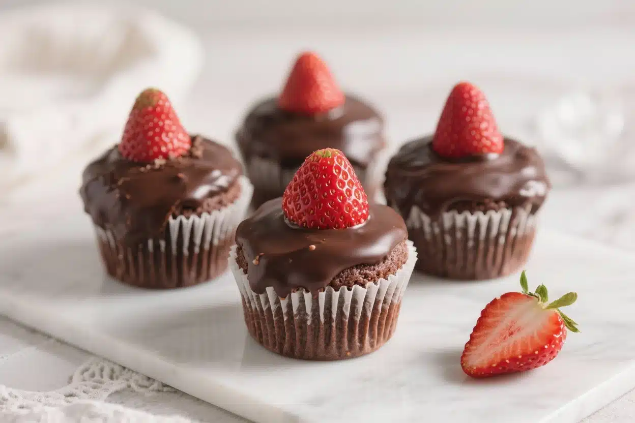 - Mini cupcakes: Bake in a mini muffin pan for 10–12 minutes. Top with chocolate and half a small strawberry.