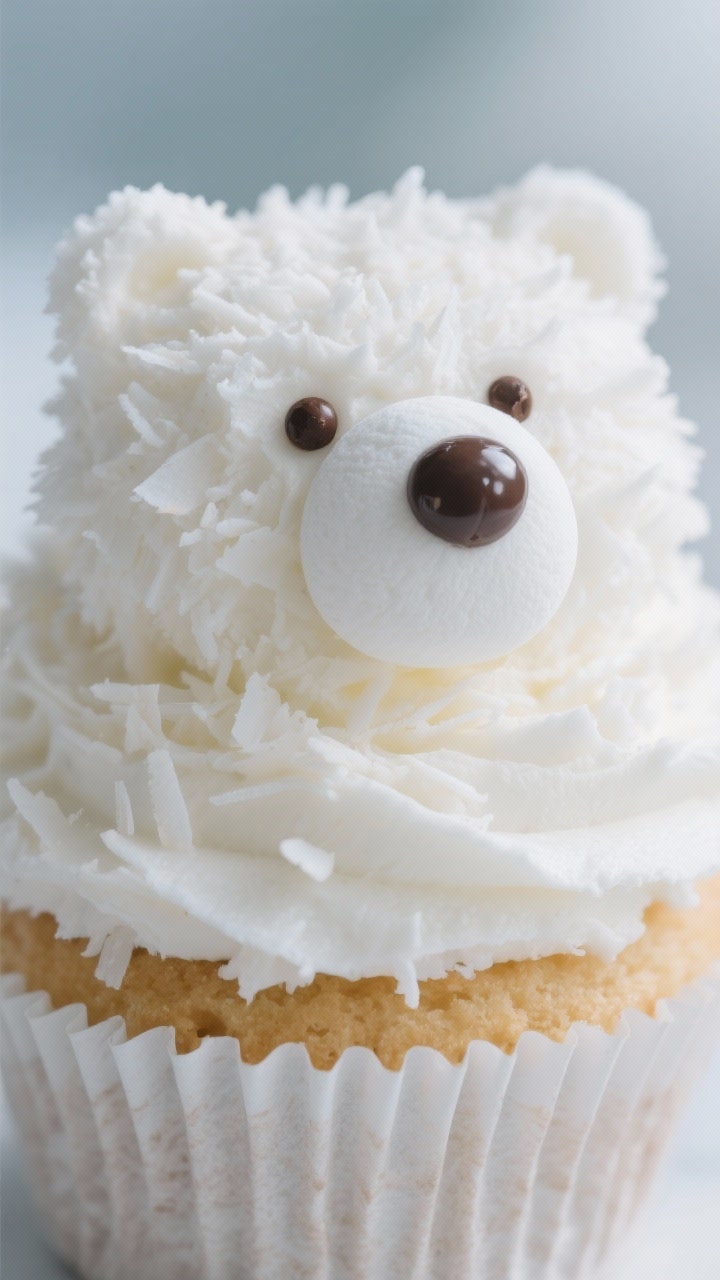 These cupcakes rely on simple techniques and pantry ingredients, so you won’t need any fancy tools. Shredded coconut creates that “polar bear fur” look with minimal effort, and marshmallows make the ears and muzzle pop.